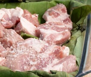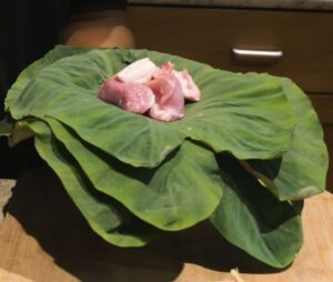 Some cooks add purple Okinawan sweet potatoes (½ pound) or cubed carrots for extra heartiness. Purists may skip vegetables entirely. It’s a matter of personal taste and family tradition. With all the lau lau ingredients prepped, the next step is preparing the leaves for wrapping.
